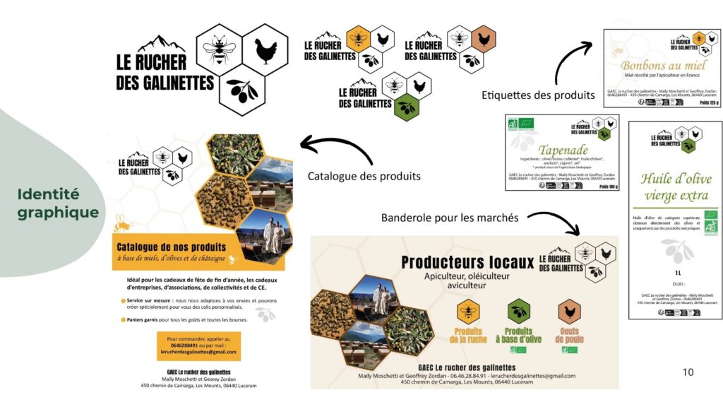 Création de l’identité graphique de l’exploitation agricole Le rucher des galinettes : logos, carte de visite, étiquettes des produits, banderole, catalogue